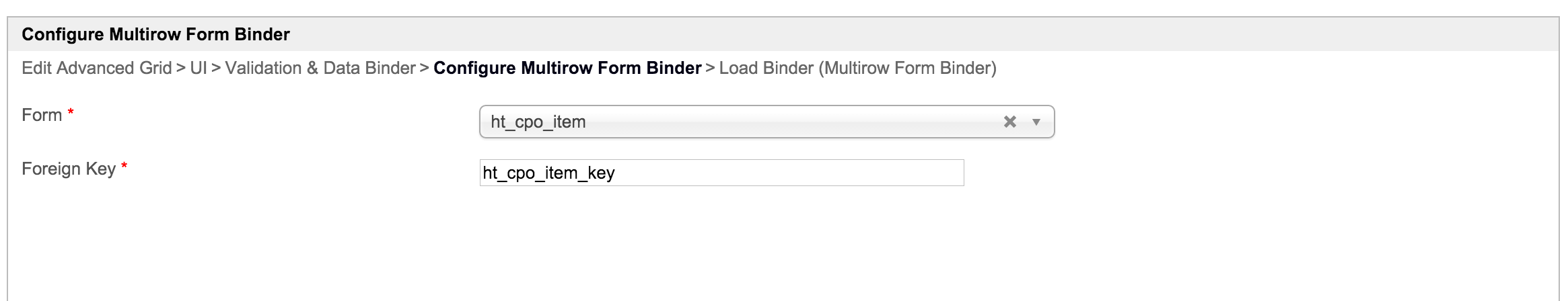- The data of "ht_cpo_item" form related to "ht_cpo" form with "cpo_item_cpo_no" field. Here, you need to make a correction in "ht_cpo" form. The "Foreign Key" of your "CPO Items" grid is configured to "ht_cpo_item_key" which should be "cpo_item_cpo_no" instead. (This will solve your imported cop items does not show up in grid issue.)