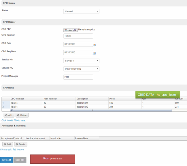 - The next thing is that item created in the process don't have any references to a grid data that was included in CPO, how to achieve it?