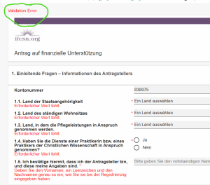 I am translating our application into German. On a form that has been translated, when I leave a required field blank, Joget displays an error message that says "Validation Error" in English. I added an id and a German translation in the messages but it it still comes up in English. I looked at the PO files on translate.joget.com and I see in the one called "console", they have the exact same translation set up the same way. I also tried adding it to the area "Platform Translation" in the Setting. That also had no effect.