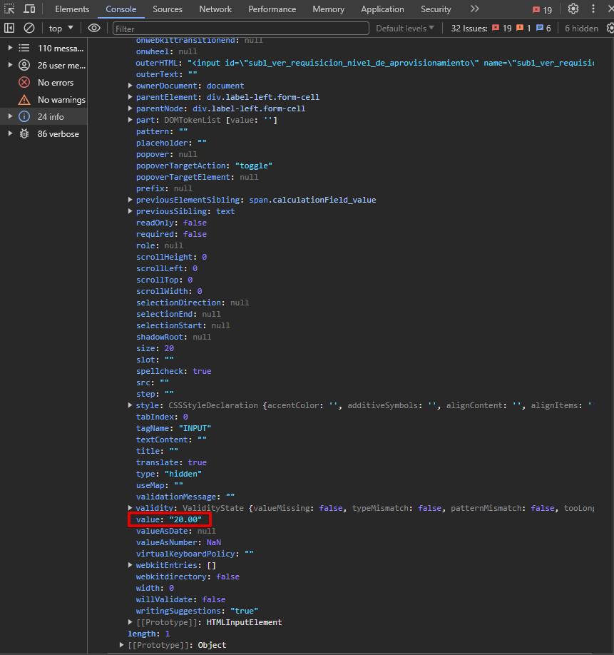 In the chrome console I can see the value stored in the object, but I can't pass this value to a variable as the other values that I get from the same form.