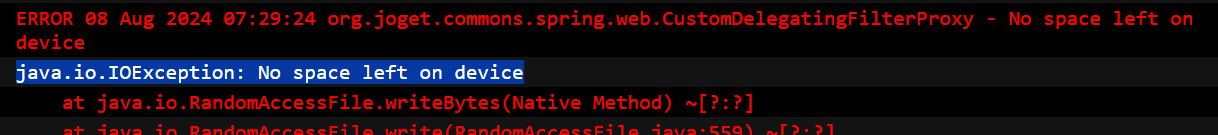 During this time, I could still access everything inside the app (App Composer, UI builder, etc), I could not just save any changes. When I checked the system logs, there was error message indicating "No space left on device", as shown in screenshot below.