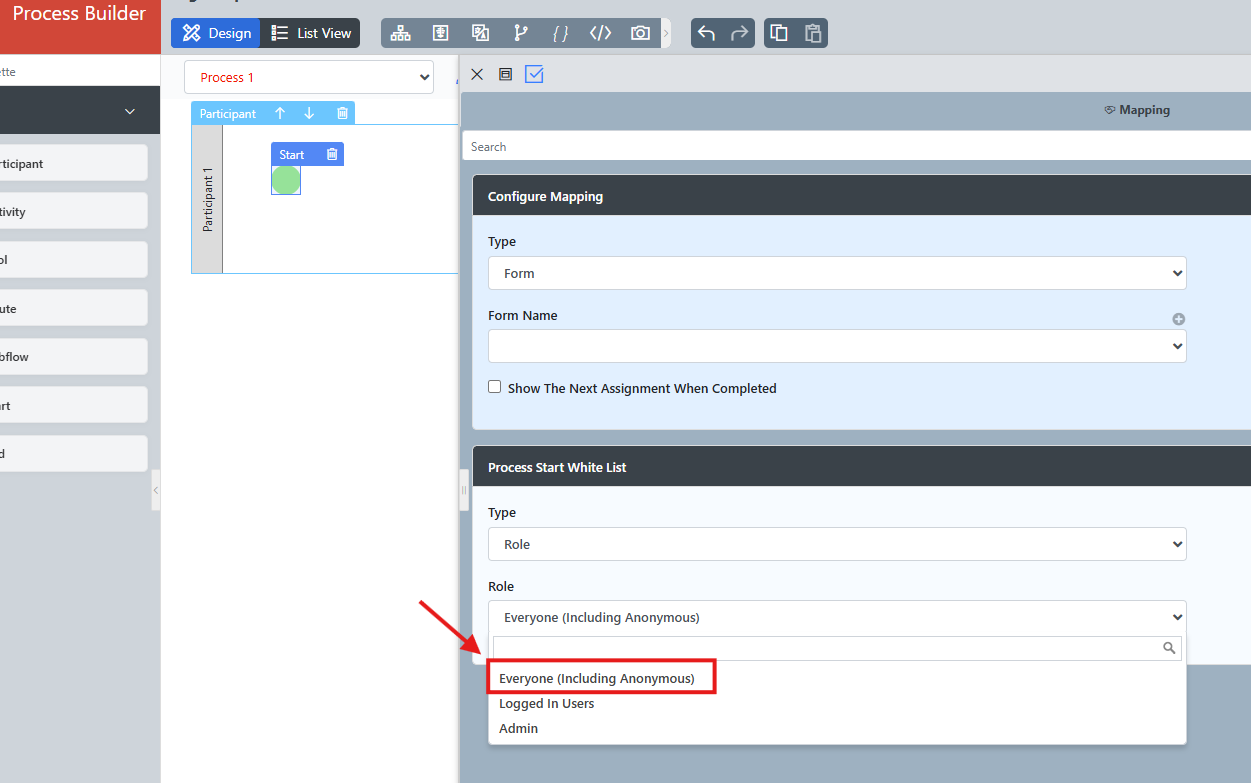 in the Process Builder, you can map the "Process Start White List" by clicking the green circle Start component