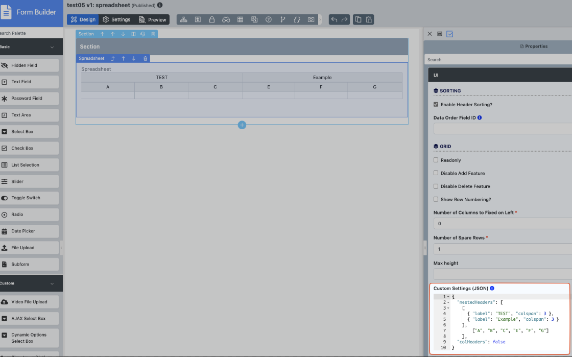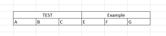 { "nestedHeaders": [ [ { "label": "TEST", "colspan": 3 }, { "label": "Example", "colspan": 3 } ], ["A", "B", "C", "E", "F", "G"] ], "colHeaders": false }
