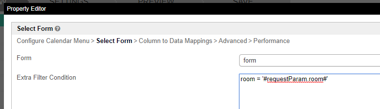 It could be the condition is not correct. You can refer to Form Data Binder for the syntax to use in the Extra Filter Condition, perhaps you can try "e.customProperties.room" instead of just "room".