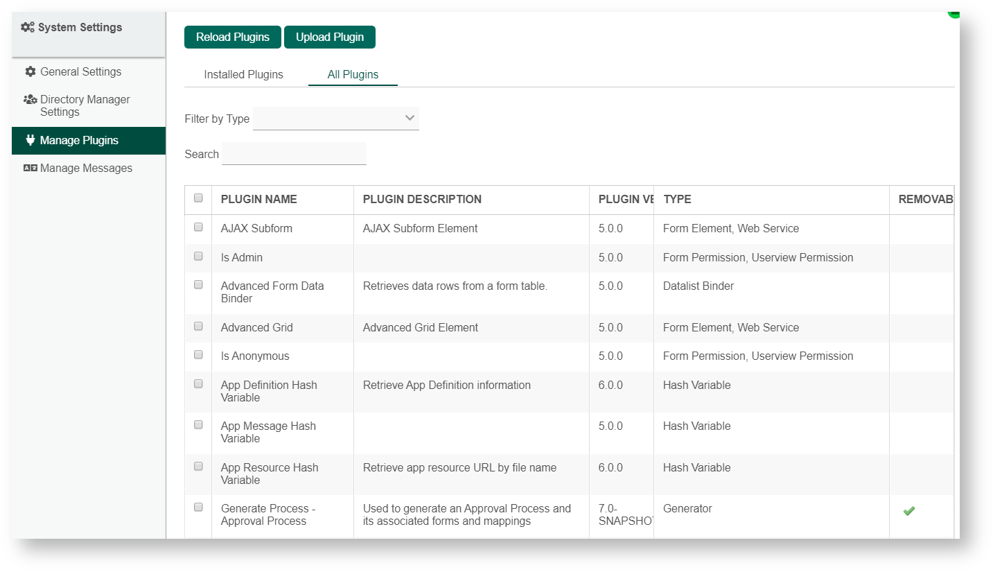 Reload Plugins - In the case of plugin jar files being loaded into Joget's wflow/app_plugins folder, you can click on this button to load all the plugins into the context.